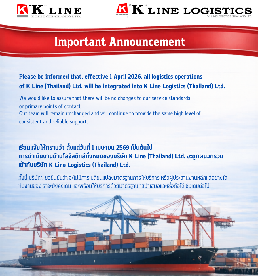 K Line (Thailand) is part of Kawasaki Kisen Kaisha, Ltd. (“K” Line), a Japanese total logistics and transportation provider. As an integral element of “K” Line’s Global Network, K Line (Thailand) offers a full range of international and domestic logistics services, including freight transportation, customs clearance, contract logistics, and shipping agency representation.